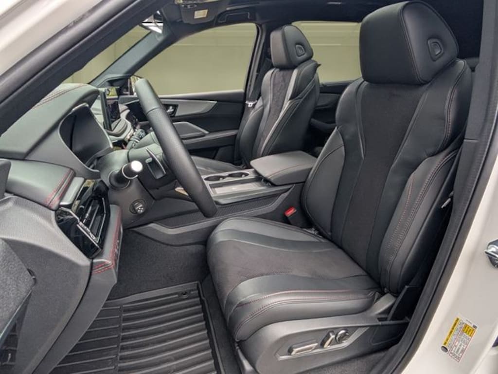 Black Leather, 19 Speakers, 3rd row seats: split-bench, 4-Wheel Disc Brakes, ABS brakes, Air Conditioning, Alloy wheels, AM/FM radio, Anti-whiplash front head restraints, Apple CarPlay/Android Auto, Audio memory, Auto High-beam Headlights, Auto tilt-away steering wheel, Auto-dimming Rear-View mirror, Automatic temperature control, Brake assist, Bumpers: body-color, Compass, Delay-off headlights, Driver door bin, Driver vanity mirror, Dual front impact airbags, Dual front side impact airbags, Electronic Stability Control, Emergency communication system: AcuraLink, Exterior Parking Camera Rear, Four wheel independent suspension, Front anti-roll bar, Front Bucket Seats, Front Center Armrest, Front dual zone A/C, Front fog lights, Front reading lights, Fully automatic headlights, Garage door transmitter: HomeLink, Heated and Ventilated Front Sport Seats, Heated door mirrors, Heated front seats, HVAC memory, Illuminated entry, Knee airbag, Lane departure: Lane Keeping Assist System (LKAS) active, Leather steering wheel, Low tire pressure warning, Memory seat, Navigation system: Google built-in (3-Years Unlimited Data Plan for In-Vehicle Apps), Occupant sensing airbag, Outside temperature display, Overhead airbag, Overhead console, Panic alarm, Passenger door bin, Passenger vanity mirror, Perforated Premium Milano Leather and Ultrasuede Seats, Power door mirrors, Power driver seat, Power Liftgate, Power moonroof, Power passenger seat, Power steering, Power windows, Premium audio system: Acura/ELS Studio 3D, Radio data system, Radio: Bang & Olufsen Premium Audio System, Rain sensing wipers, Rear air conditioning, Rear anti-roll bar, Rear reading lights, Rear seat center armrest, Rear window defroster, Rear window wiper, Remote keyless entry, Security system, Speed control, Speed-sensing steering, Speed-Sensitive Wipers, Split folding rear seat, Spoiler, Sport steering wheel, Steering wheel memory, Steering wheel mounted audio controls, Tachometer, Telescoping steering wheel, Tilt steering wheel, Traction control, Trip computer, Turn signal indicator mirrors, Variably intermittent wipers, Ventilated front seats, Wheels: 20" x 9J Aluminum Alloy, Black Leather. 2026 Acura MDX A-Spec SH-AWD Platinum White Pearl 3.5L V6 SOHC i-VTEC 24V AWD 10-Speed Automatic