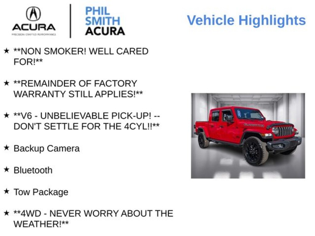 At Phil Smith Acura, every pre-owned vehicle is offered with our exclusive MarketSmart Pricing - a stress-free, market-based pricing strategy designed for premium transparency. Prices are set using real-time market data, vehicle condition, mileage, and reconditioning, so you never have to negotiate or second-guess. Additional dealer-installed items, such as tint and protection packages, may apply and are not included in the online listed price. Our mission is simple: no pressure, no surprises - just the right price and a happy customer driving off every time.