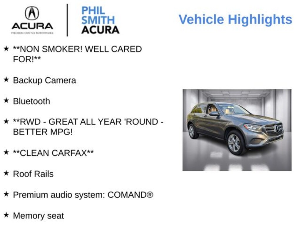 We looked for SUV's for some time, narrowing it down to an Acura RDX or GLC. The Mercedes is more posh and drives solid and refined. The Honda/Acura vehicles are super-competent, for sure, but they feel ordinary compared to the Mercedes. The GLC was about $5,000 more, but felt like you were getting more, so the value to me was the same. I enjoy the steering assist (which the RDX also has), the Distronic speed control, and the lane assist on long trips. Just another step toward autonomous vehicles. It does shout at you if you keep your hands off the wheel for an extended period, to keep you engaged while driving, but the temptation is there. The Speed Limit Assist is pesky, however, as it reads the speed limit sign and matches your cruise control to that speed as a maximum speed. In my case, it sometime mistakes the 80 mph signs (I live in Utah) with 60 mph signs and suddenly decelerates, scaring the driver, passengers, and nearby drivers. There's probably a fix for that (besides turning off the feature). We have the ambient lighting package, which is fun to use. My wife and I love the car and hope to keep it for a long time.… - 5.0